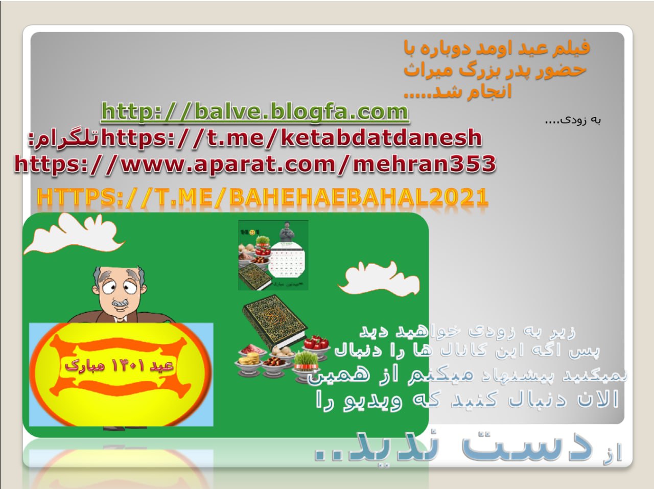 فیلم تبریک عید 1401 که توسط آقای مهران اسدالهی ساخته و در سایت های و پیامرسان های دیگر برای شادابی مردم به صورت رایگان منتشر و نمرات بالایی را کسب نموده است.